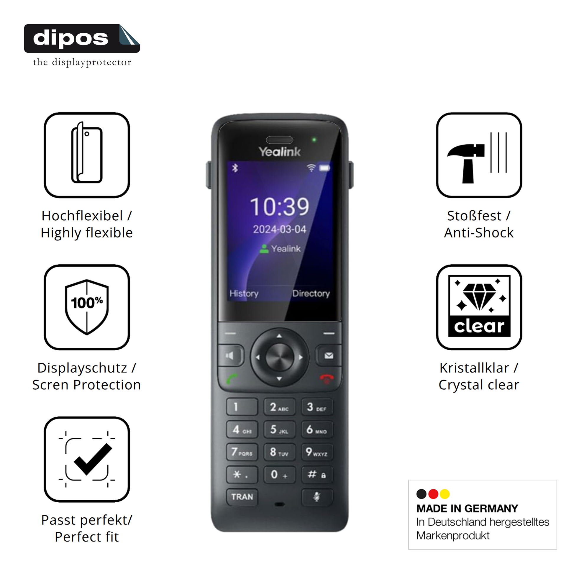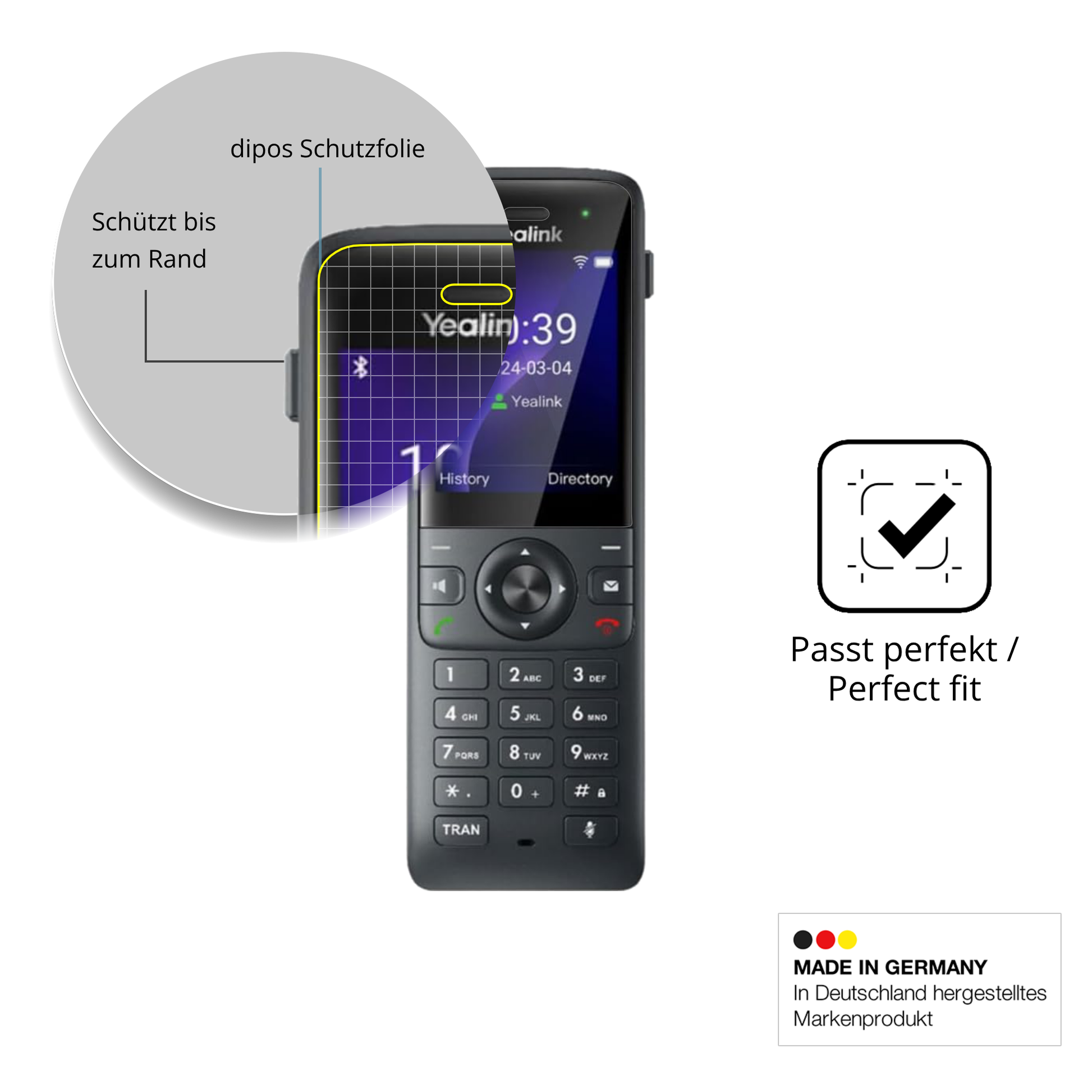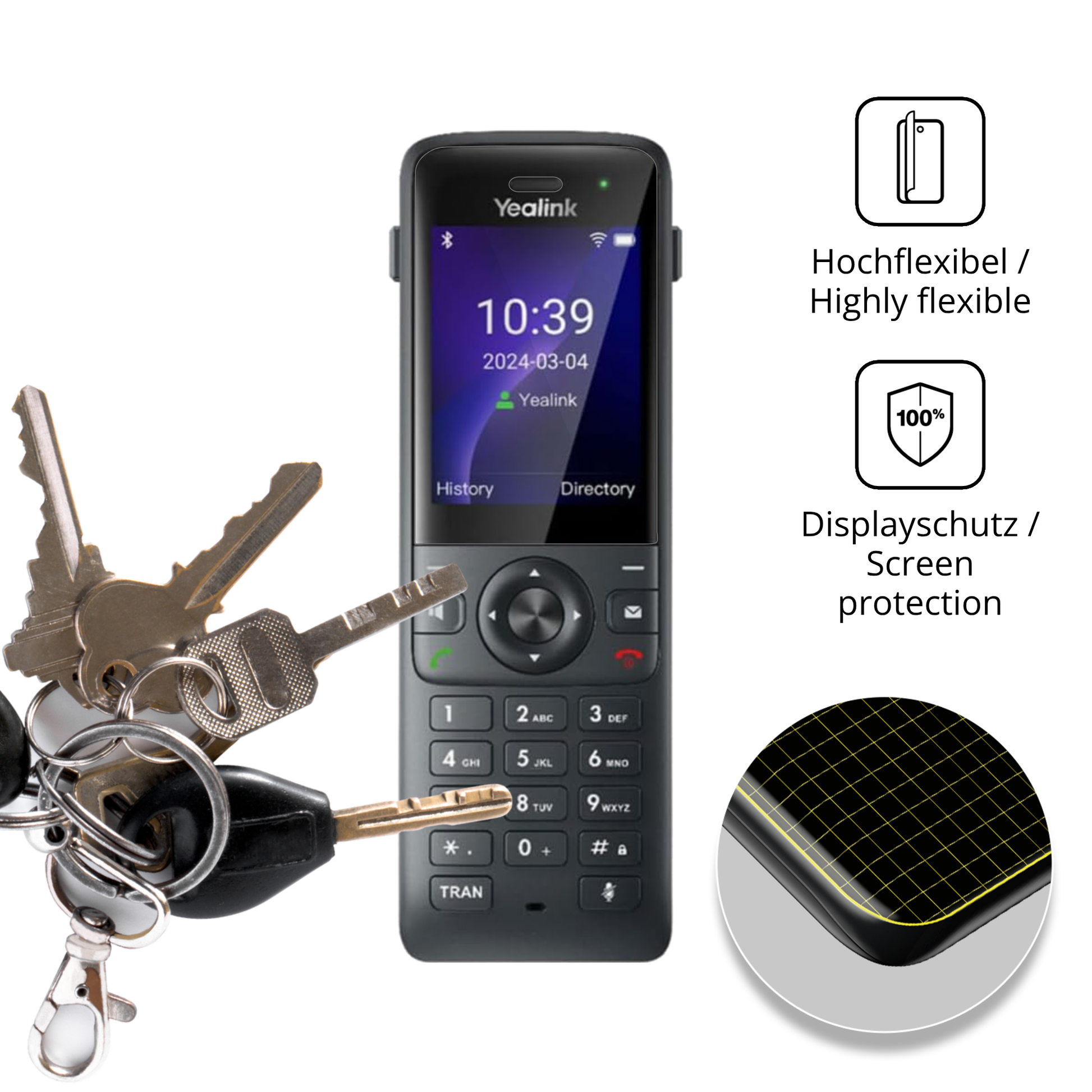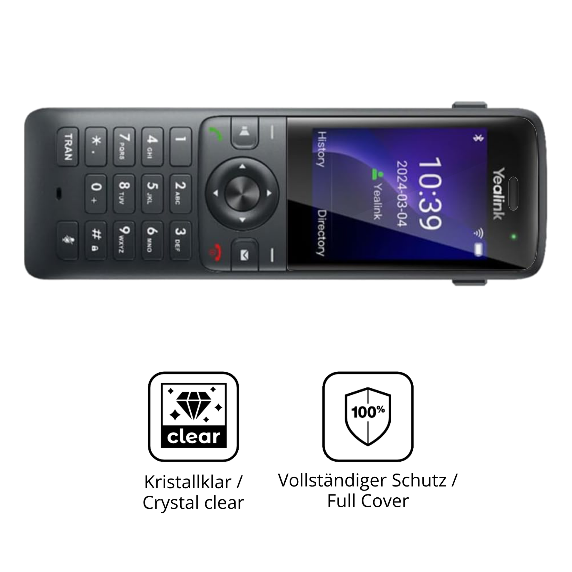 Wenn dein Yealink W73H herunterfällt, ist dein Display optimal geschützt. Die Folie splittert nicht und schützt wirksam vor Glasbruch & Kratzern. Das ist wichtiger als extreme Härte wie 9H. -