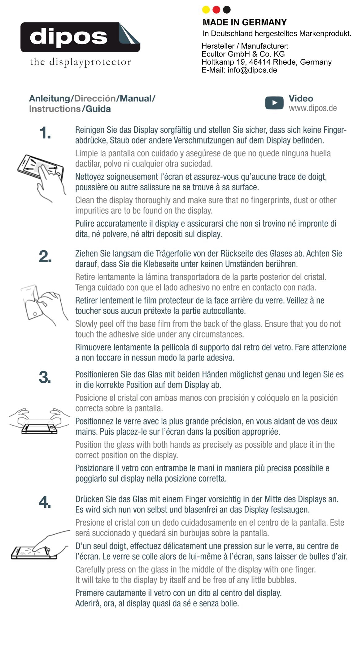 Anbringung: Das Material selber hat eine ähnliche Steifigkeit wie Echtglas. Es ist ca. 0,2 mm dünn und nicht so wabbelig, wie Sie es von klassischen Kunststofffolien kennen. Dementsprechend ist die Anbringung genauso leicht wie bei Echtglas. Sie ziehen also den unteren Träger einfach komplett ab, legen das dipos Glass aufs Display und fertig. Selbstverständlich können Sie es jederzeit wieder rückstandsfrei entfernen.