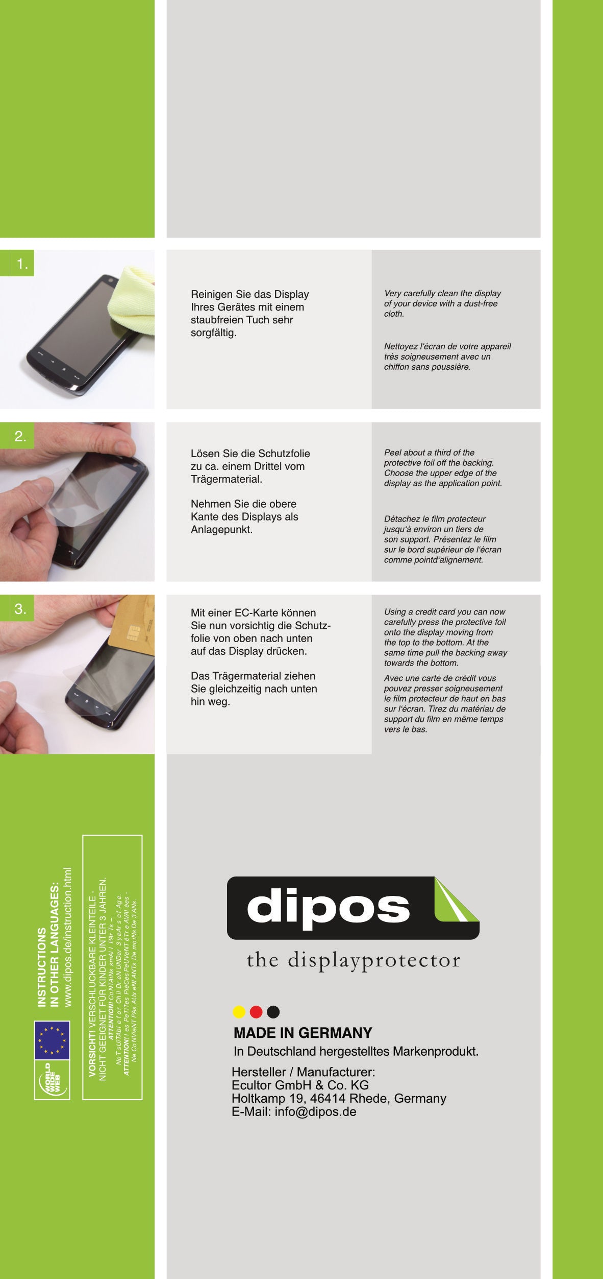 Keine unnötigen Zubehör Extras – blasenfreie Anbringung mit fusselfreiem Tuch und Bankkarte, 100% recyclebare Verpackung. Eine bebilderte Anleitung und ein Video zeigen dir, wie einfach es geht. -