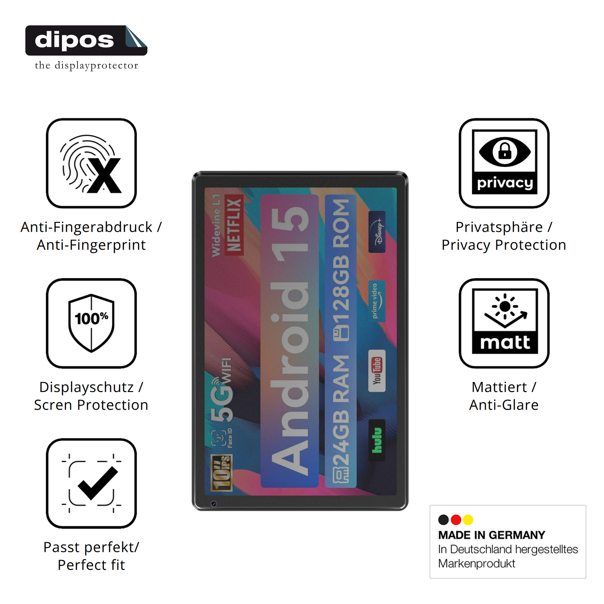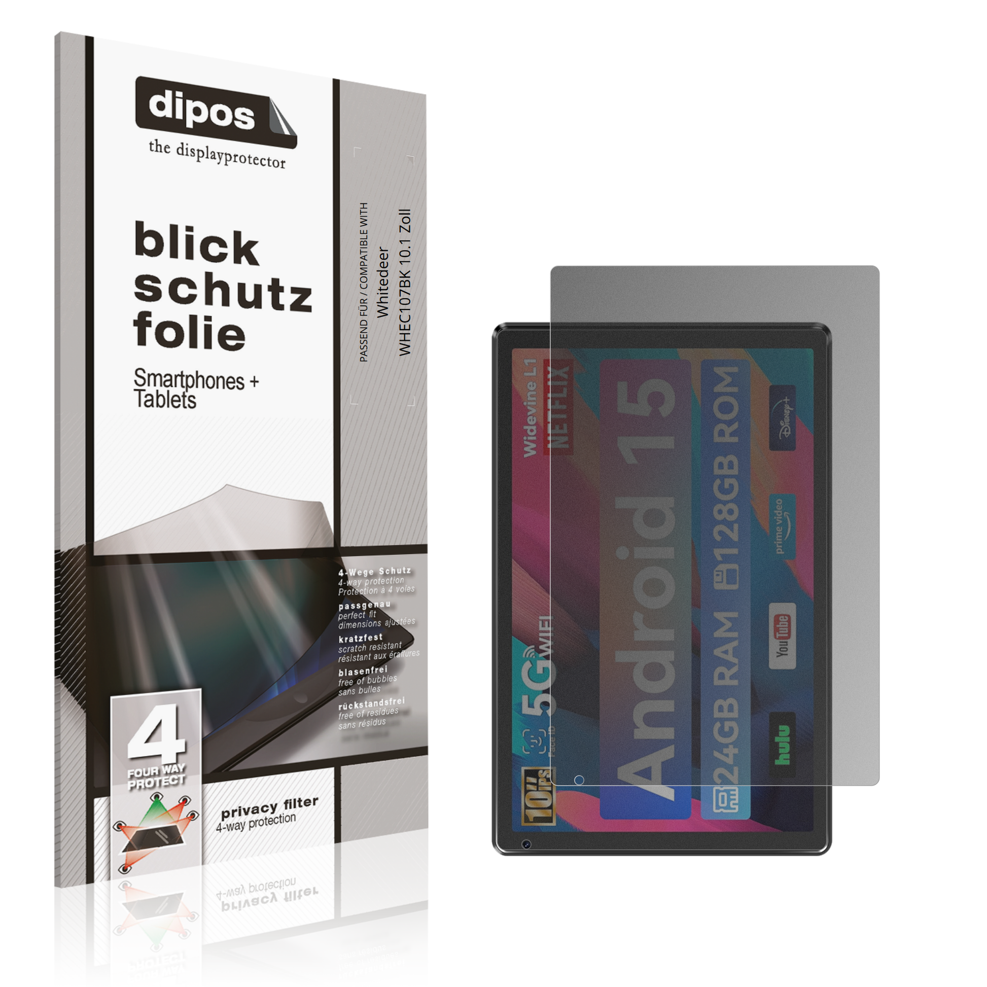 Wichtiger Hinweis: Durch den integrierten Blickschutzfilter wird die Displaydarstellung etwas abgedunkelt, was aber durch ein Erhöhen der Displayhelligkeit ausgeglichen werden kann. Weiterhin empfehlen wir die Nutzung der dipos Blickschutzfolie eher auf Geräten in dunklen Farben, da es bei weißen bzw. hellen Geräten optisch vielen Kunden nicht zusagen wird. Hierbei ist aber selbstverständlich Ihr Geschmack entscheidend.