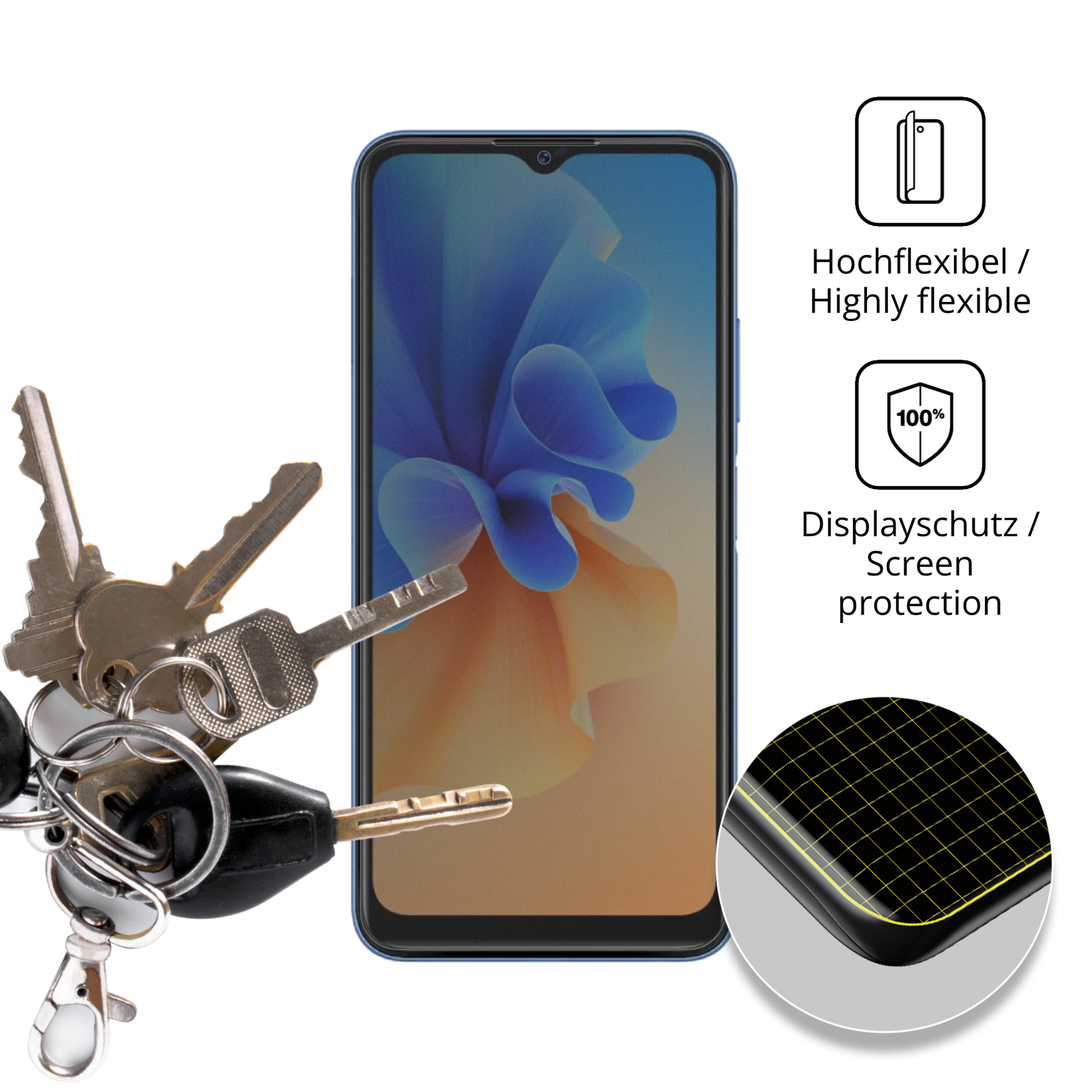 Die Ergebnisse unabhängiger Materialtests sind sensationell gut im Vergleich zu den 9H Schutzgläsern. dipos FLEX Deine beste Wahl! Und kleine Alltagskratzer verschwinden durch die selbstheilende Oberfläche von selbst.